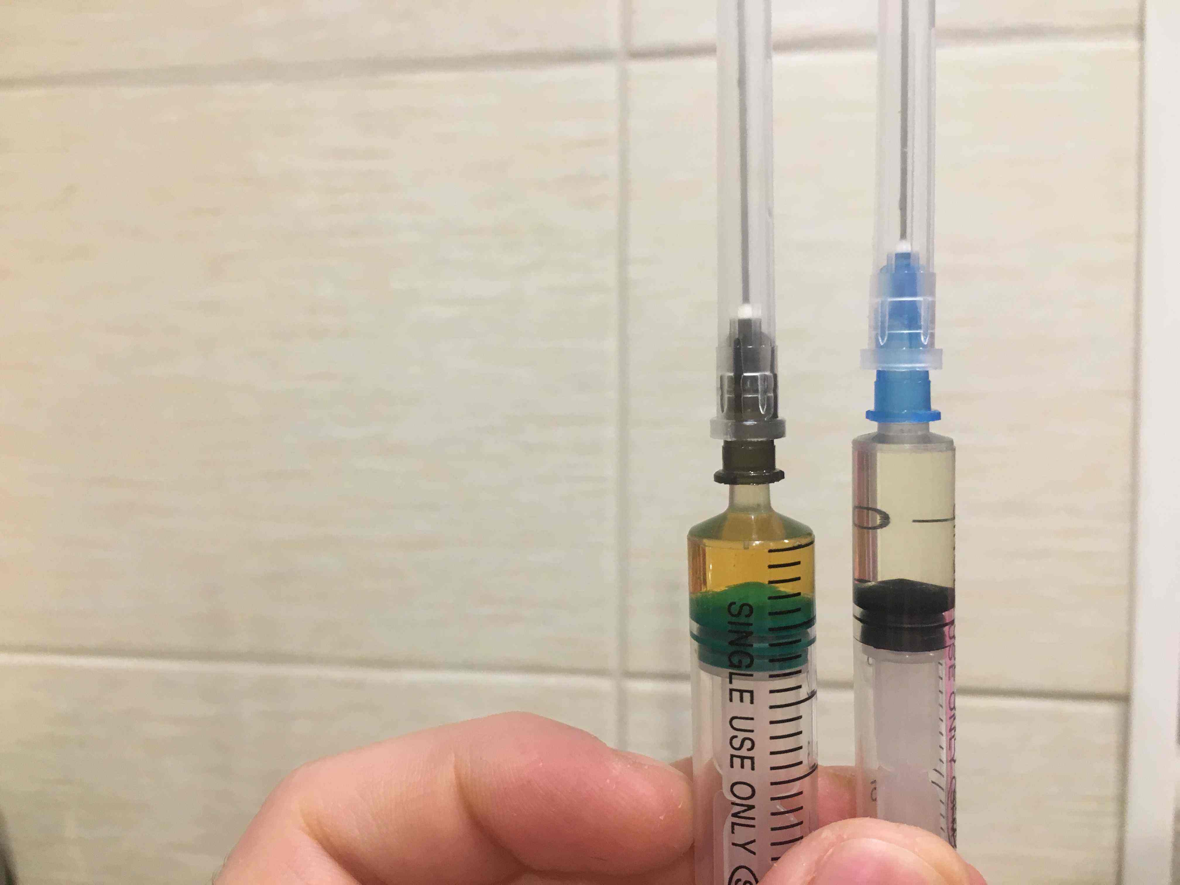 Обратил внимание что в шприцах содержимое разного цвета после 5 дней ожидания в тёмном месте, взбалтывал хорошо. Поставил тот, который темнее:D