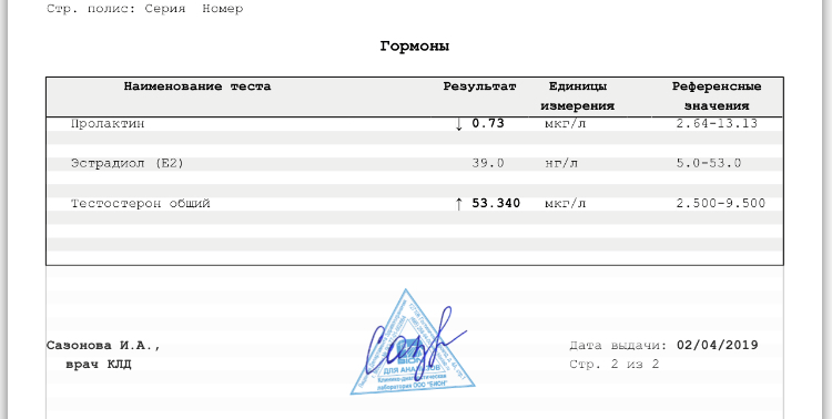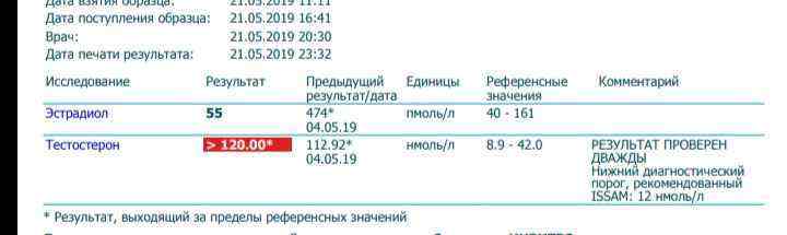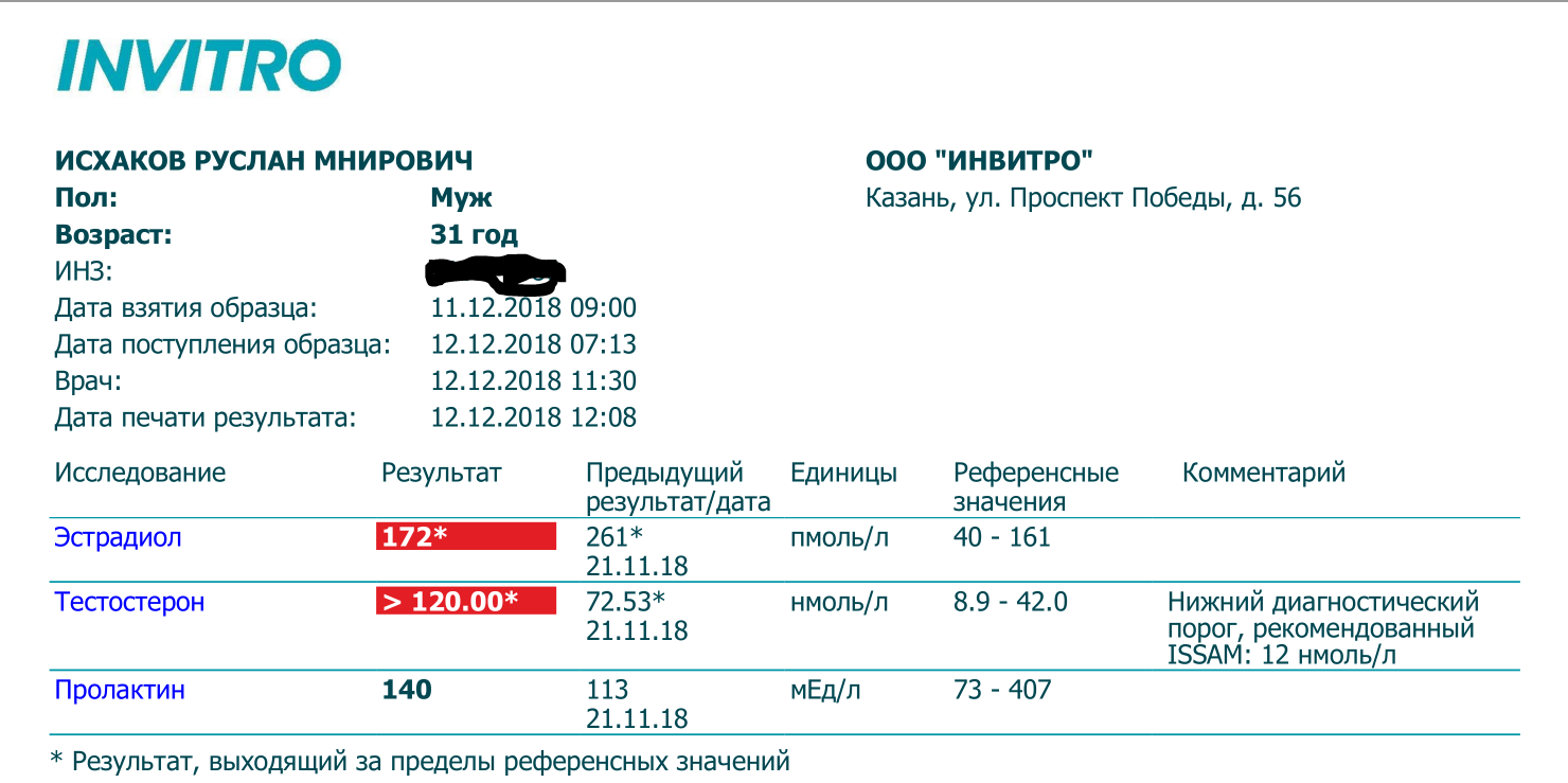 Ставил 3 недели по 200 мг, 2 раза в неделю, итого 400 мг/нед всего лишь. Параллельно шёл Болденон для устранения ароматизации (на анализах показаны предыдущие значения). Сдал анализ спустя 24 ч. после последнего инжекта.